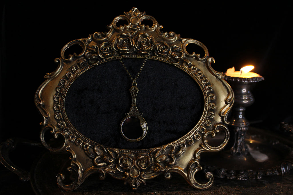 A wee little mirror, made into a necklace using hypoallergenic hardware.