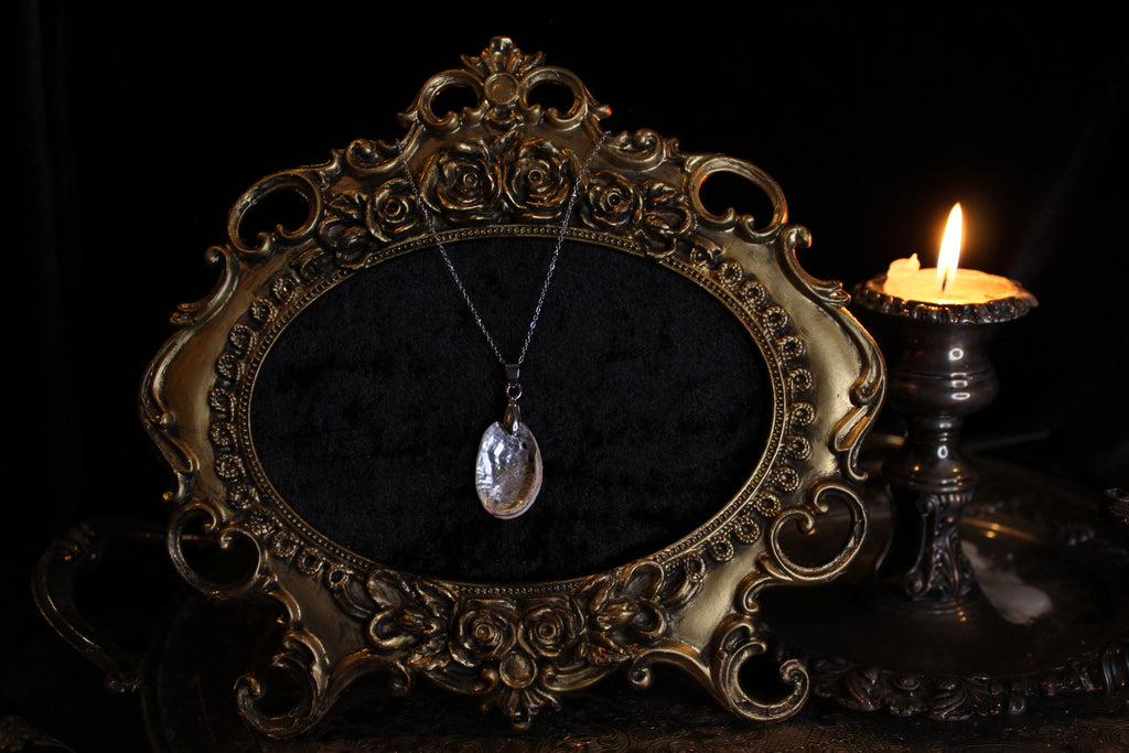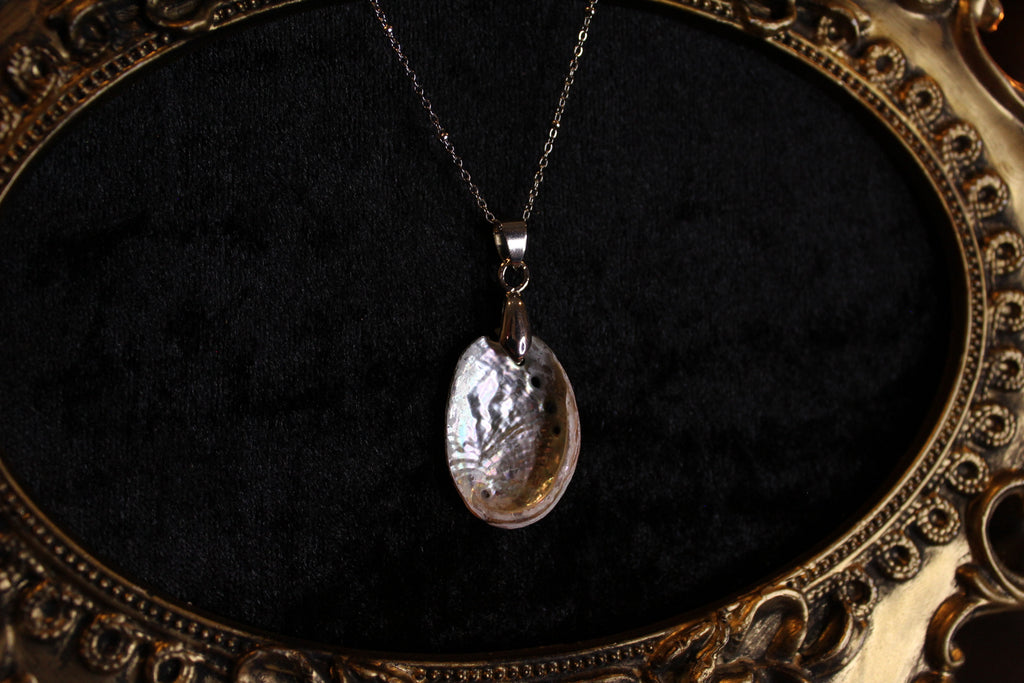 a wee little abalone shell made into a necklace using hypoallergenic chain.