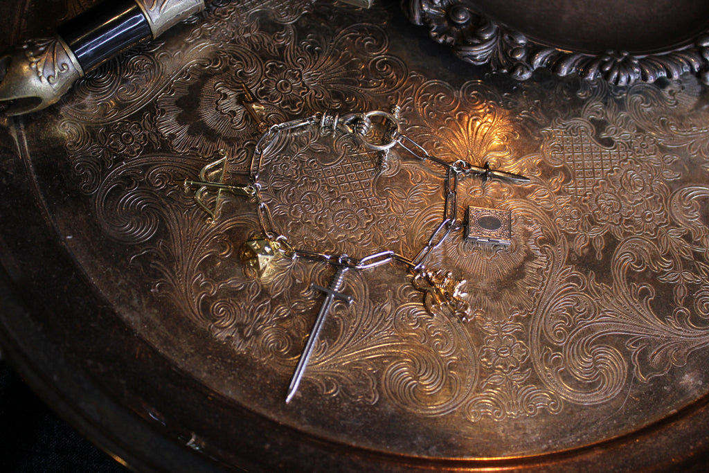 This bracelet is an homage to the classic tabletop role-playing game: Dungeons and Dragons. Made using tarnish resistant chain and hypoallergenic hardware.