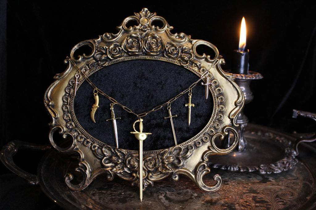A collection of little swords, made into a necklace using hypoallergenic hardware.