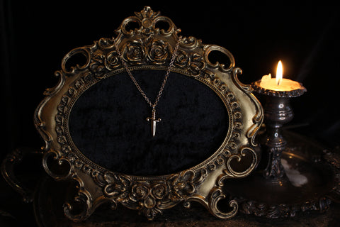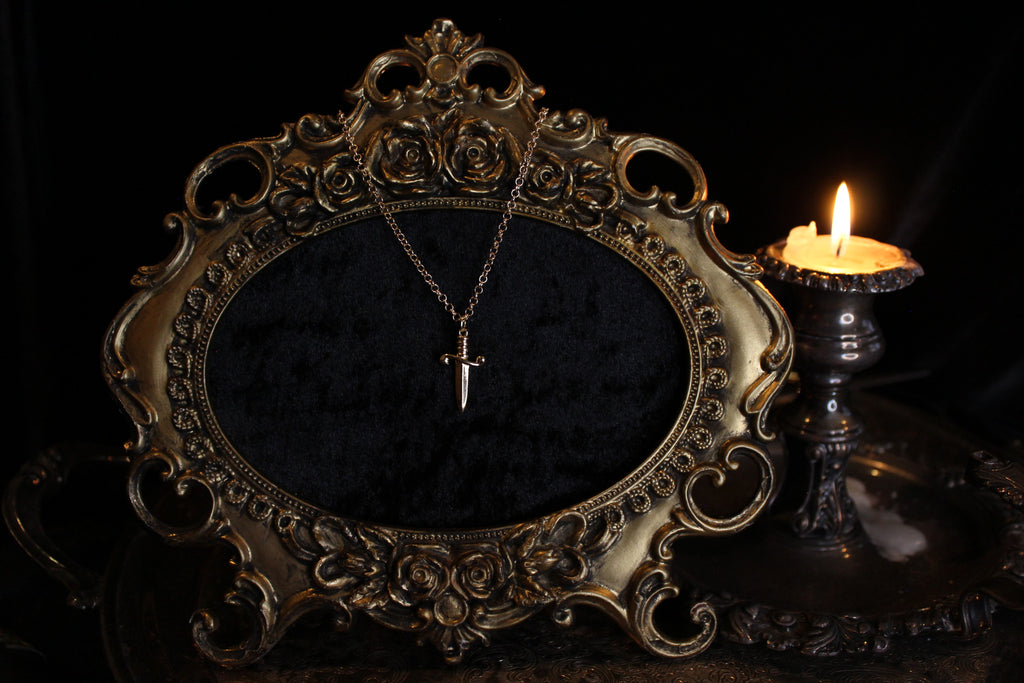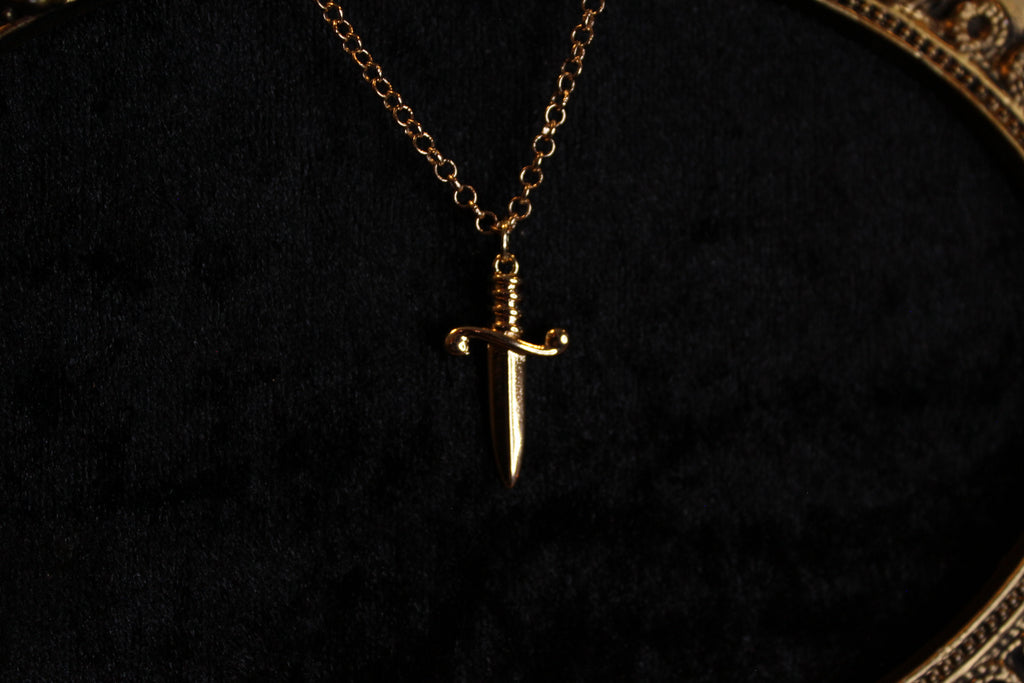 A wee little dagger, made into a necklace using hypoallergenic hardware.