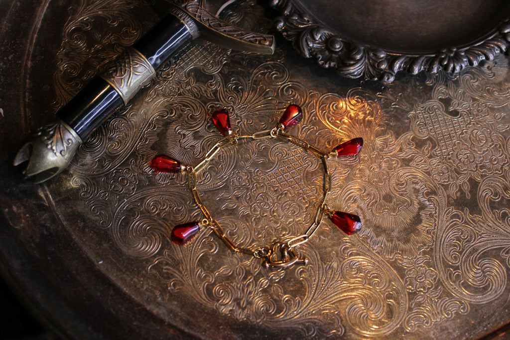 This bracelet is an homage to the story of Persephone and Hades. Made using six pomegranate aril charms, tarnish resistant chain and hypoallergenic hardware.