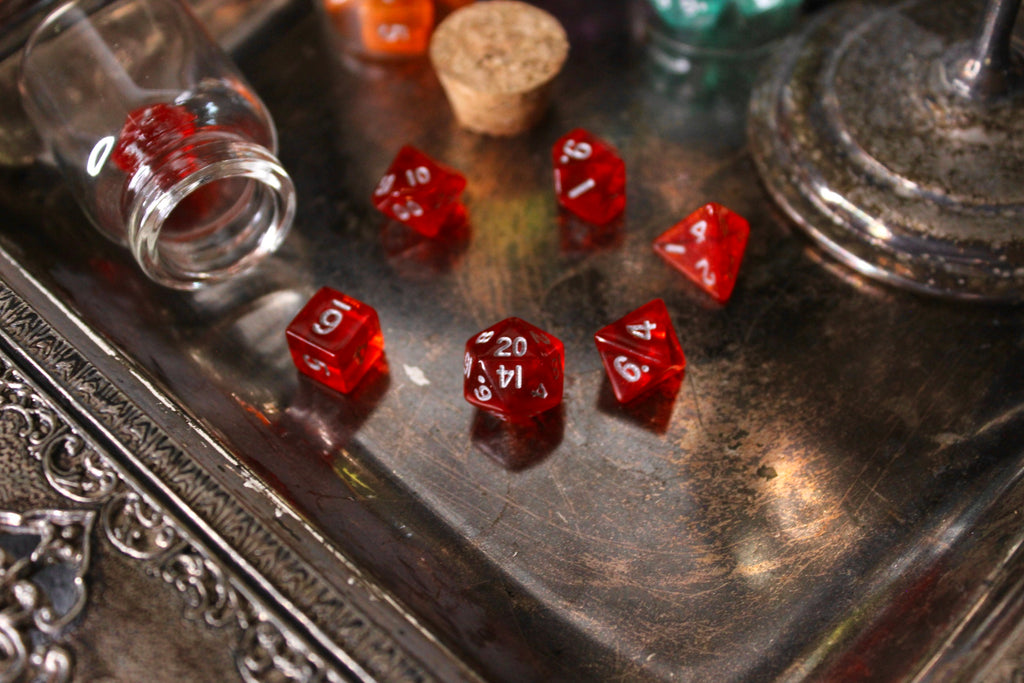 Each glass potion vial contains a full set of polyhedral dice, that you can roll to your hearts content once you remove the cork!