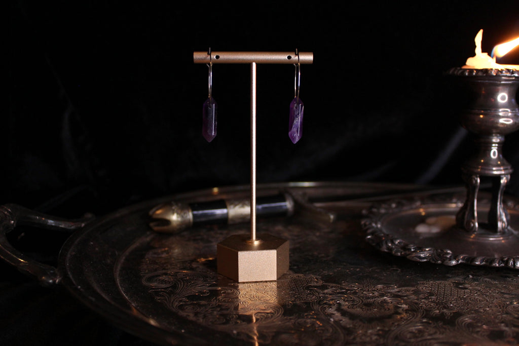 Amethyst double terminated points made into earrings using hypoallergenic hoops.