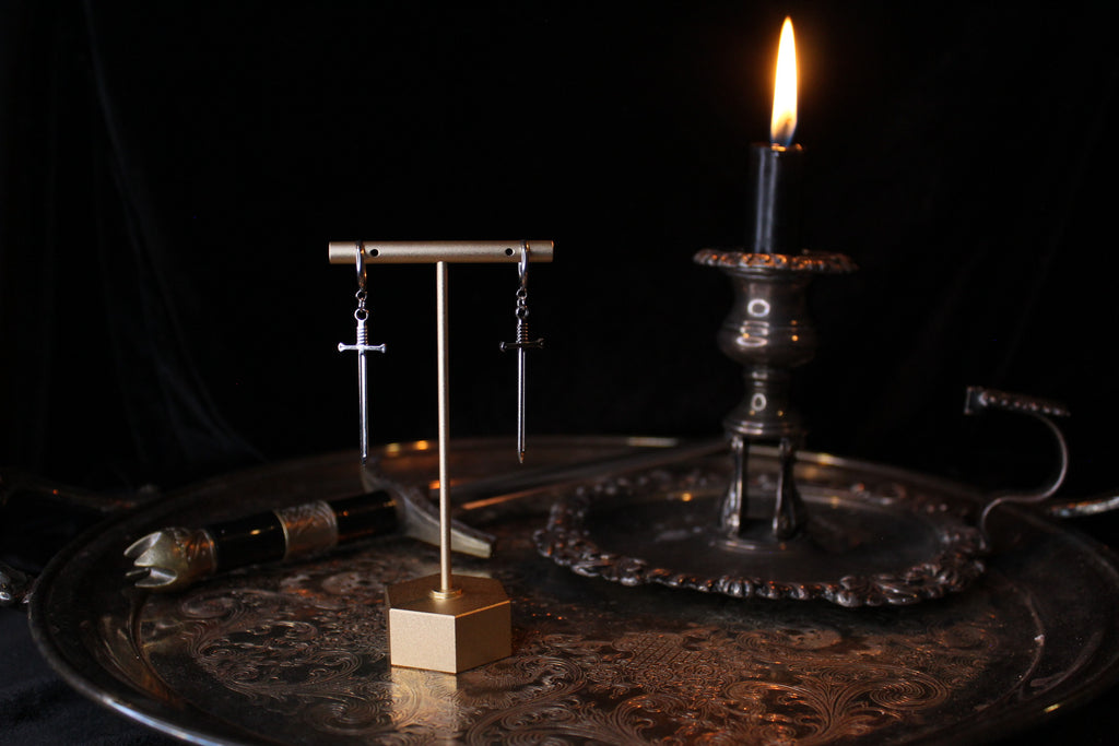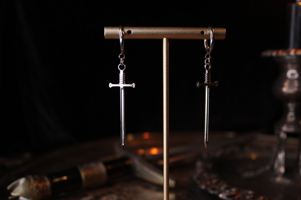 Tiny little swords, made into earrings using hypoallergenic hoops.