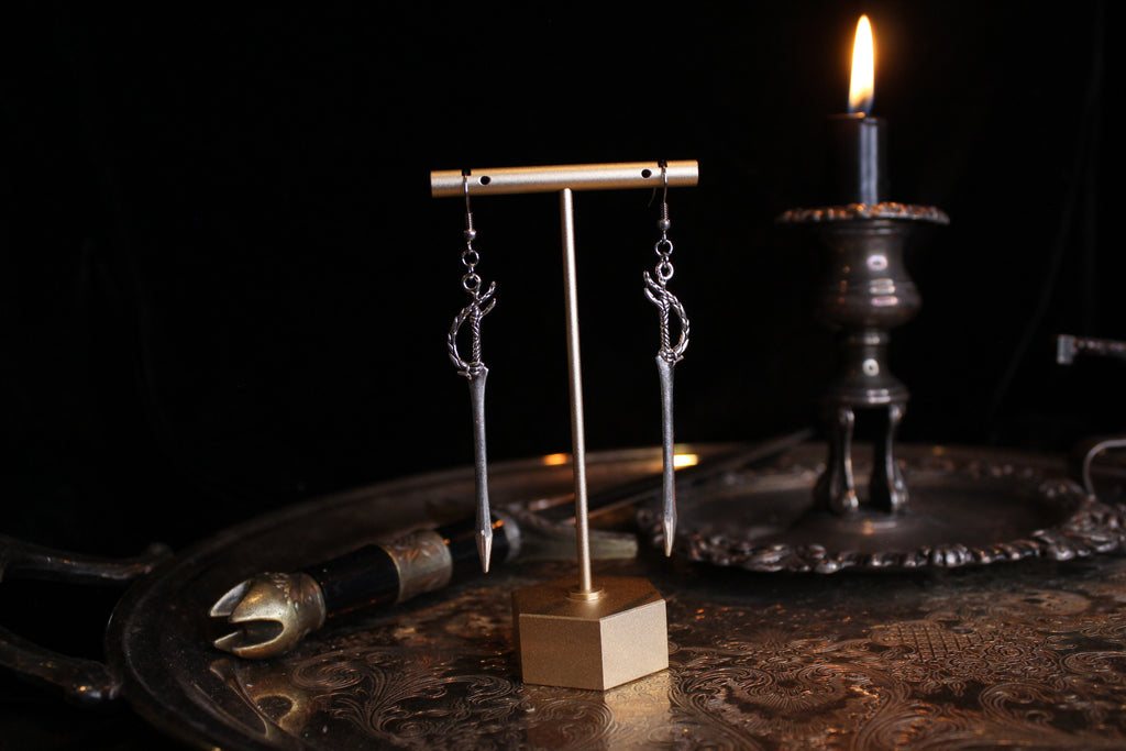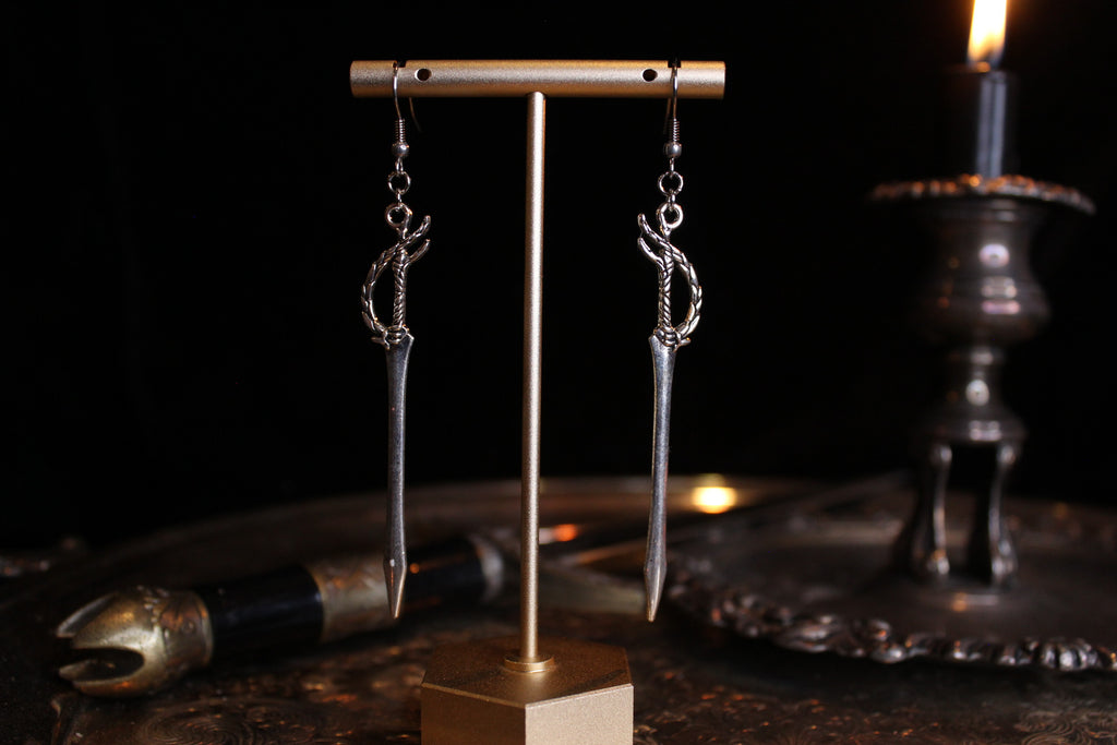 Tiny little swords, made into earrings using hypoallergenic hooks.