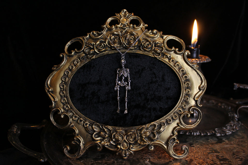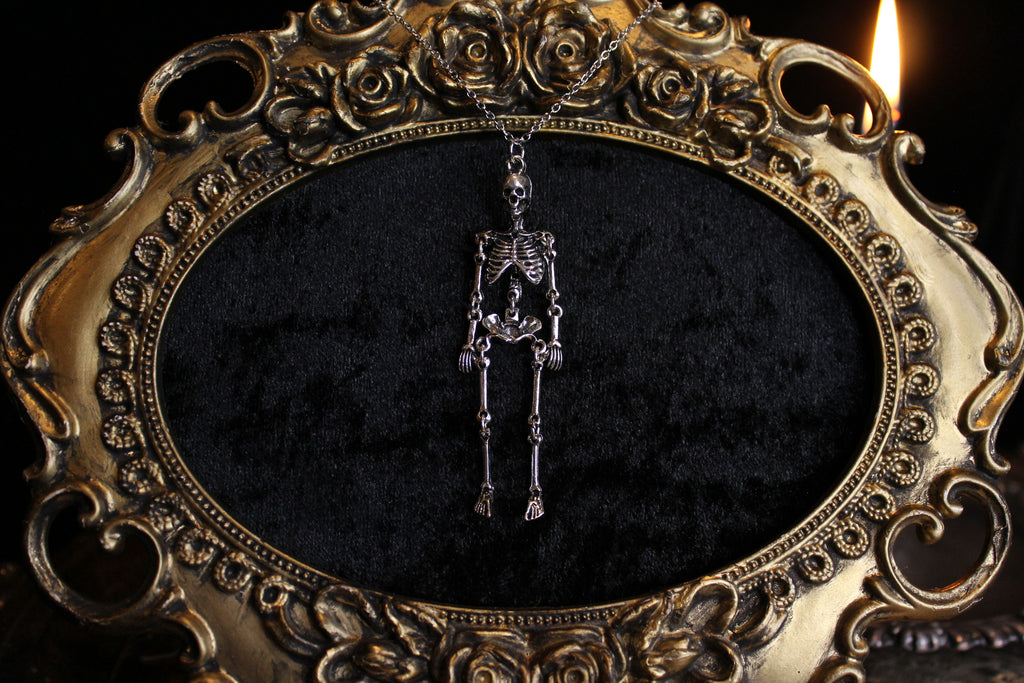 A wee little skeleton, made into a necklace using hypoallergenic hardware.